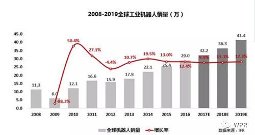 首先从全球来看,2014年开始全球制造业转型升级,工业机器人需求明显增多,当年增长率达到19.5%。到了2016年仍按保持高速增长,全球工业机器人销量约29万台,同比增长12.4%。预计2017年全球工业机器人销量为32.2万台,2019年将达到41.4万台。