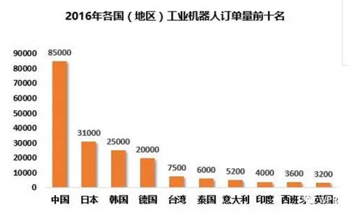 从2016年各国(地区)工业机器人订单量来看,亚太地区无疑成为最大消费国,其中仅中国工业机器人订单就达到8.5万台,超过日本、韩国、德国三国订单的总和。