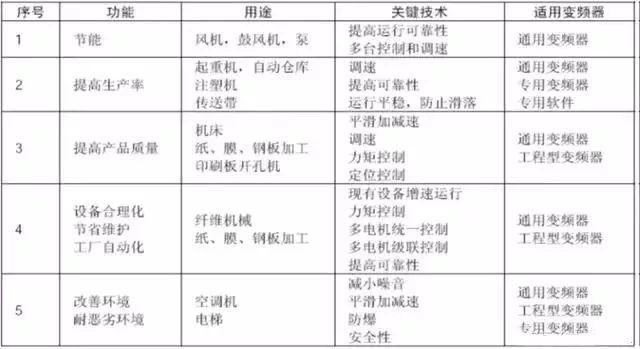 变频器和交流电机构成的可调速传动称为变频器传动,其功能用途如下。其中可能互为关连,实际上无明确分类,此表仅作参考。