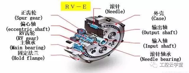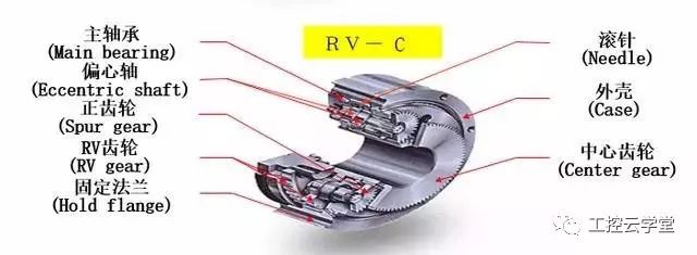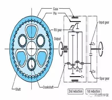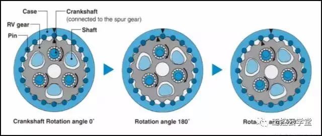 在外壳的内环圈内装有圆柱形的滚针,RV齿轮的偏心运动引起滚针与摆线形RV轮齿的啮合和脱离,产生多组RV轮齿与滚针同时啮合,提高负载能力。 由于RV齿数比滚针少1个数目,因此当偏心轴旋转一周时,如果固定外壳 (case),则RV齿轮与输入轴同向转1个齿的角度。