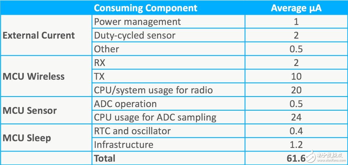 通过平均计算每个组件的功耗来测量或估计功耗。如果CPU占空比为两个百分点,并且在60μA/ MHz时工作在20 MHz,则CPU的消耗为24μA。