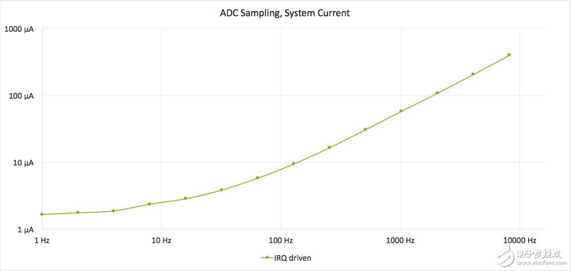 图1 采用中断进行ADC采样,显示出随着每秒采样次数的增加,功耗也在增加