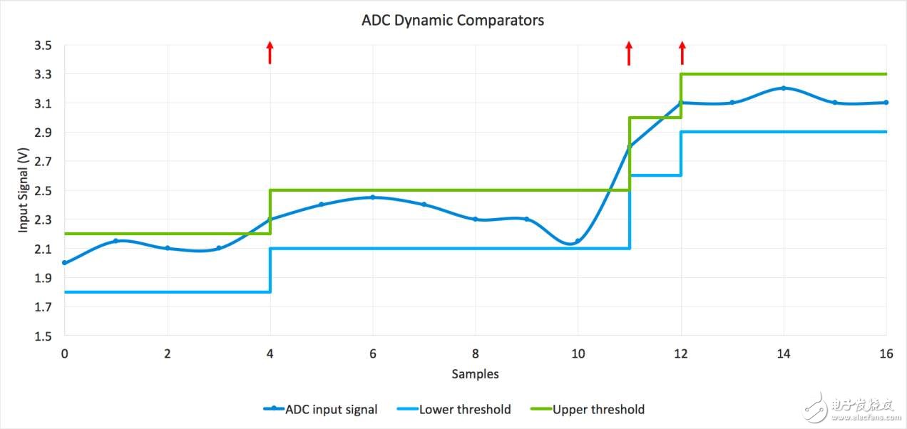 当使用比较功能监视信号时,一种方法是测量信号,然后根据这个信号设置阈值,只要信号在阈值范围内,那么当ADC测量信号时,系统可以保持在深度睡眠模式,当然CPU也保持在睡眠模式。