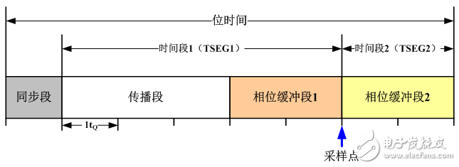 同步段位于一个位的起始位置,CAN-bus规定跳变沿为同步信号,但是发送节点发送一个位跟接收节点接收到这个位之间存在网络传播延迟,传播段则是为了补偿这段传播延迟,由于采样点位置在相位缓冲段1跟相位缓冲段2之间,通过设置相位缓冲段1和相位缓冲段2的值,可以调整采样点位置,保证每个位采样点一致。缓冲段的长度调节范围则是由同步跳转宽度(SJW)决定。