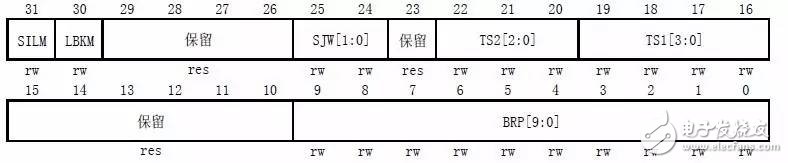 简单的了解了CAN总线位时间的分段后,我们来看看一个节点的波特率到底要如何设置。如图2是某ARM内核的CAN位时间特性寄存器 (CAN_BTR)。