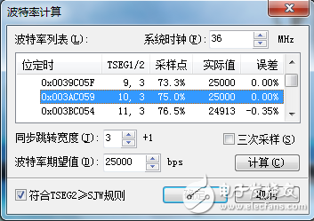 了解设置波特率的原则后,我们采用ZLG致远电子的波特率计算软件,对25kbps波特率的设置参数进行计算,计算结果如图3。