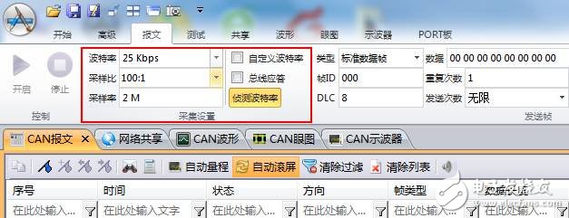 自动波特率识别:采用CANScope自动侦测波特率的功能,对CAN卡的波特率进行识别,识别结果为25kbps;