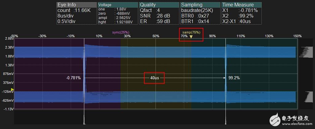 位时间测试:用CANScope的眼图功能对当前波特率下CAN卡进行位时间测试,位时间为40us,与25kbps波特率的位时间相符。