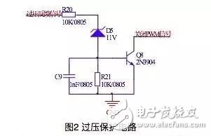 解答:假设正常输出电压为12V,当输出过压时,稳压管有电流流过,三极管导通,输出低电平去关断PWM信号。其中,过压的阈值主要由稳压二极管决定,稳压二极管一般要通过2mA才能实现稳压,通过改变稳压二极管实现大范围调整;R20和R21实现电阻分压,在一定范围内能影响过压阈值的大小,R20的另一作用就是限流;电容C9的目的一方面是为了吸收尖峰电压,另一方面能起到稳定电压作用,还起到一定的延时作用