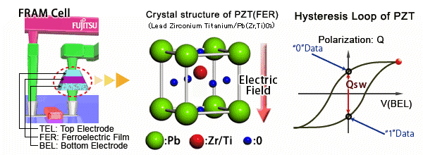 当一个电场被加到铁电晶体时,中心原子顺着电场的方向在晶体里移动。当原子移动时,它通过一个能量壁垒,从而引起电荷击穿。内部电路感应到电荷击穿并设置存储器。移去电场后,中心原子保持不动,存储器的状态也得以保存。