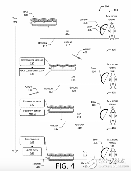除了黑客入侵外,诸如直接射落等更为直截了当的“劫机”方式也是亚马逊需要考虑的方面。如图中所示,在可能的攻击武器靠近机身时,机载“危险感应”(compromise module)模块将检测到箭矢的存在,然后启动自动防故障机制,让自主无人机采取紧急飞行姿态避免受到攻击,并降落至地面安全区域进行检查。当然,专利图示中的箭矢仅仅是亚马逊无人机未来可能遇到的威胁之一,而诸如子弹这些武器的飞行速度可比其要快的多,因此亚马逊无人机未来依旧有可能会受到一些小型枪械武器的严重威胁。