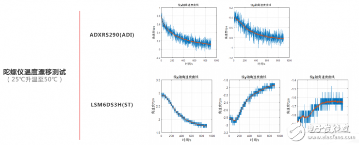 上面是一个陀螺仪温度漂移测试结果图,测试的环境是从25℃升温至50℃,整个过程保持陀螺仪静止不动,陀螺仪的准确输出应该是一个固定的数值。但从结果来看,两款传感器的实际输出都受到温度变化影响。相比而言,ADXRS290(ADI)的输出数值变化幅度较小,基本上在0.5左右。