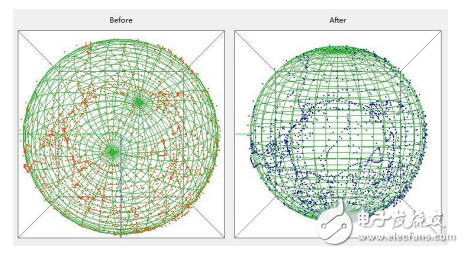 以磁罗盘的粗校准为例,由于地球上任意位置的地磁场强度在较长时间跨度内都可视为是恒定的,当转动磁罗盘时,根据相对运动可假设磁罗盘固定不动,而地磁场矢量随之在转动,其矢量端点在空间的轨迹应为一个标准的球体,但由于传感器存在误差,实际测出的数据并不严格都在球体的表面,这时候就需要根据测量出来的数值以及已知的准确值来计算两者之间的换算关系,也就是该款磁罗盘的误差模型。在以后使用该款磁罗盘时就可以根据粗校准得出的误差模型来处理测量值,使得测量值的误差减小。