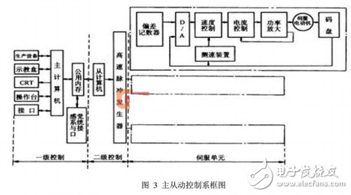 2)主从控制系统:采用主、从两级处理器实现系统的全部控制功能。主CPU实现管理、坐标变换、轨迹生成和系统自诊断等:从CPU实现所有关节的动作控制。其构成框图,如图3所示。主从控制方式系统实时性较好,适于高精度、高速度控制,但其系统扩展性较差,维修困难。