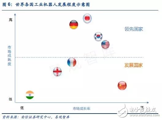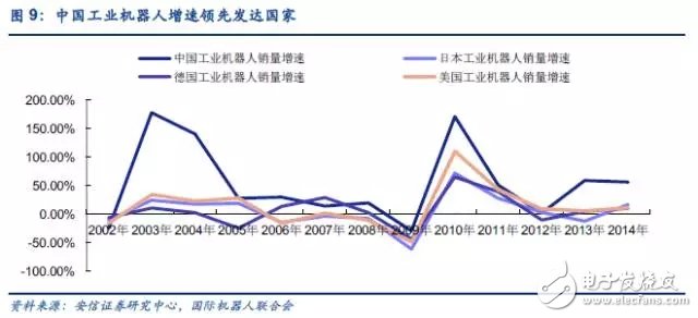 对比工业发达的日本、德国和美国,我国工业机器人需求增速的走向与他们大致相同,但增速一直较高。在2013年以前,日本一直是全球最大的工业机器人市场。2013年,我国工业机器人销量一举成为全球最高。