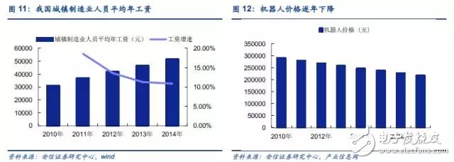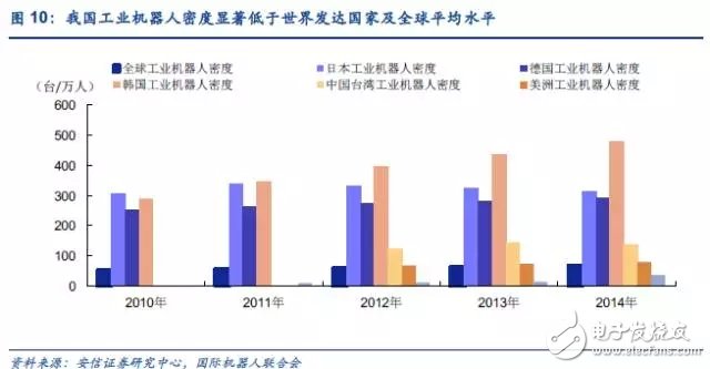 从机器人保有度上看,每万人拥有的机器人数量为机器人保有密度指标,我国2014年为36台/万人,日本为314台/万人,德国为292台/万人,韩国为478台/万人,中国***为138台/万人,全球平均为66台/万人。我国的机器人保有密度不仅与先进工业国家有差距有十倍之多,与全球平均水平相比都有翻番空间,这种差距也间接的显示了未来工业机器人的需求空间。