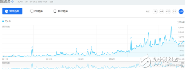 当下,无人机绝对炙手可热。从百度指数上可以看到,自2011年开始到现在,无人机的热度基本处于高速攀升状态。这证明不仅是业内对其非常关注,普罗大众也因为无人机的快速发展而展现出浓厚的兴趣。