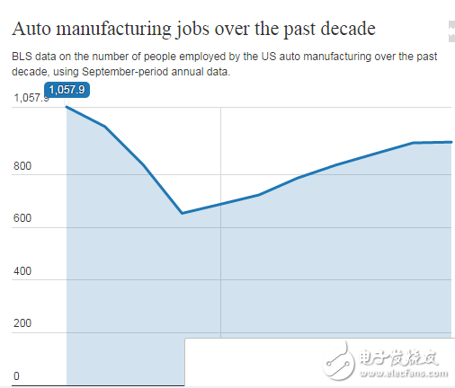 对于制造行业来说,他们最大的担忧是任何种类的机器人都会取代许多人类工作,汽车行业同样如此。汽车研究中心统计显示,从1985年到2015年间,通用、福特以及菲亚特-克莱斯勒等底特律“三巨头”的时薪岗位已经从60万人降至13.7万人。美国劳工统计局数据显示,自从2000年来,美国汽车制造行业中超过30.7万个岗位已经消失。