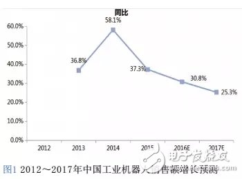 2015年,中国工业机器人市场规模整体增幅比较乐观,销售量达到82,495台,同比增长39.6%,销售额达到128.2亿元,同比增长37.3%。在宏观经济和制造业增速下滑的态势下,中国工业机器人市场继续维持30%以上增长速度。鉴于工业机器人替代空间巨大,预计未来几年,中国工业机器人市场仍将维持高速增长态势。