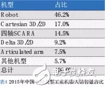 从机型来看,2015年中国所销售的工业机器人中,以Robot和Cartesian3D/2D为主,Robot销售量占比达到46.2%,Cartesian3D/2D销售量占比达到17.0%,二者销售量之和达到总体销售量的63.2%。Robot销售量最大的主要原因在于其主要应用在汽车领域,汽车领域是机器人应用最为成熟的领域。Cartesian3D/2D主要应用在塑料橡胶和金属加工等领域,加之较低的价格,Cartesian3D/2D成为市场份额仅次于Robot的机型。