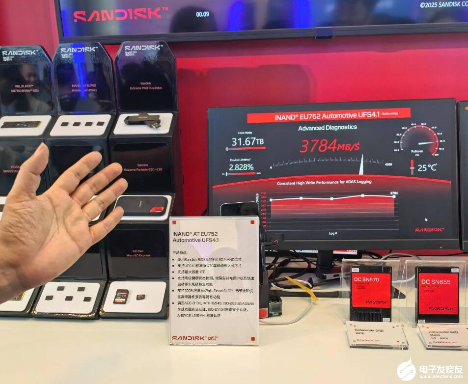 3月12日当天,在CFMS | MemoryS 2025上,闪迪展示了首款采用UFS 4.1标准的车规级产品:Sandisk iNAND AT EU752 UFS4.1 嵌入式闪存驱动器。近期,比亚迪天神之眼C、华为智驾ADS3.0赋能的智能汽车相继上市。 “目前车规级UFS3.1的接口速度可以满足,但是闪迪首发的全球首款车规级UFS4.1性能又做了跃升,车规级Sandisk iNAND AT EU752 UFS4.1,采用闪迪最新BiCS8 218层 3D NAND的突破性解决方案,性能可达此前闪迪UFS 3.1产品的两倍以上,容量达市场现有产品的2倍,最高达1TB,对于未来汽车上更多的AI应用、更多的数据和模型上车都提供前瞻性的支持,智能汽车厂商下一代产品有可能应用到车规级UFS4.1。”闪迪现场的工作人员表示。