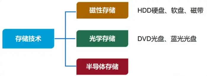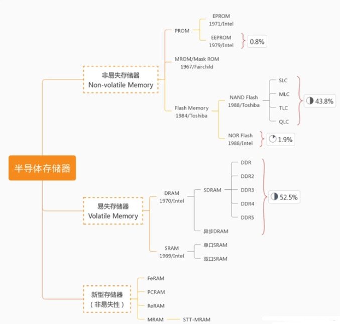 非易失性存储器主要包括PROM(可编程只读存储器:EPROM(可擦除可编程只读存储器)、EEPROM(带电可擦可编程只读存储器))、MROM/Mask ROM(掩模式只读存储器)和Flash Memory(闪存:NAND Flash、NOR Flash),即使在断电后也能保留存储的数据信息;易失性存储器主要包括DRAM(动态随机存储器)和SRAM(静态随机存储器), 断电后不会保存数据;新型存储器主要包括FeRAM(铁电存储器)、PCRAM(相变存储器)、ReRAM(电阻式随机存取存储器)和MRAM(磁性随机存储器)等。