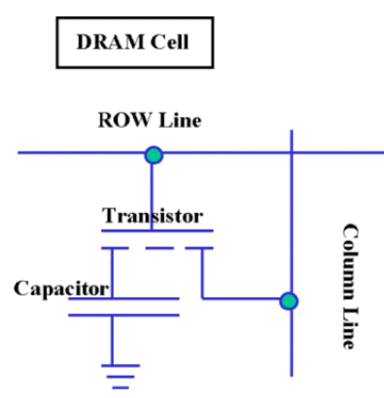 DRAM中的基本存储单元由两个元件组成:晶体管和电容器。当需要将一个位放入存储器时,晶体管用于对电容器充电或放电。从位线读取的动作迫使电荷流出电容器。