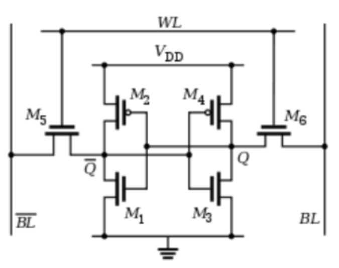 SRAM cell有多种不同结构,下图为6个MOS组成的SRAM cell。M1/M2、M3/M4分别为2个反相器,在供电情形下可以锁住0/1信息,不需动态刷新。