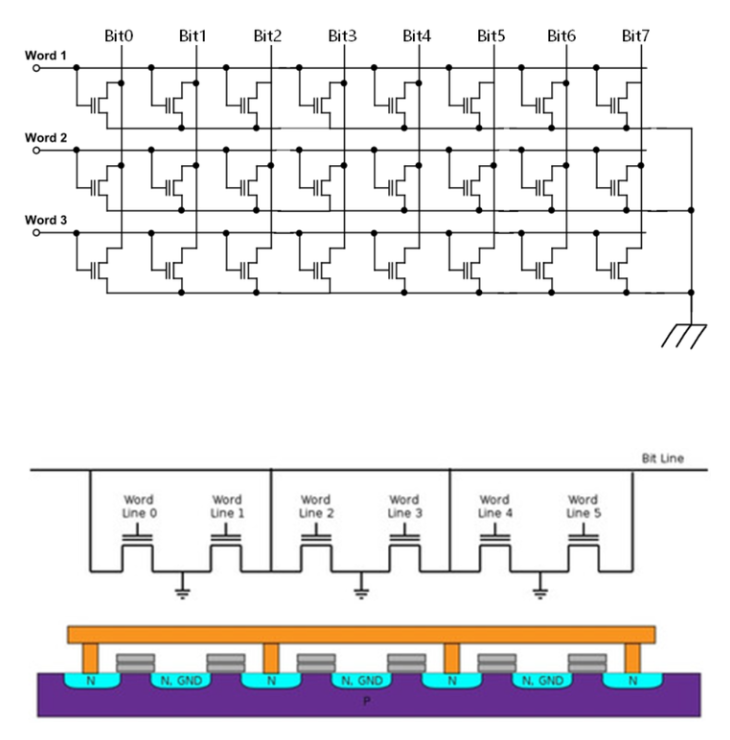 (2)基本存储单元的并联结构决定了NOR FLASH具有存储单元可独立寻址且读取效率高的特性,因此适用于code-storage,且程序可以直接在NOR 中运行(即具有RAM的特性)。