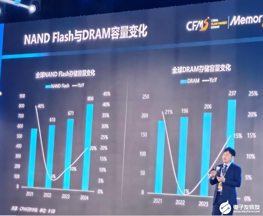 从存储产品分类来看,2024年,NAND FLASH将超过8000亿GB单量,相比去年增长20%,DRAM预计增长达15%,将达到2370亿GB单量。