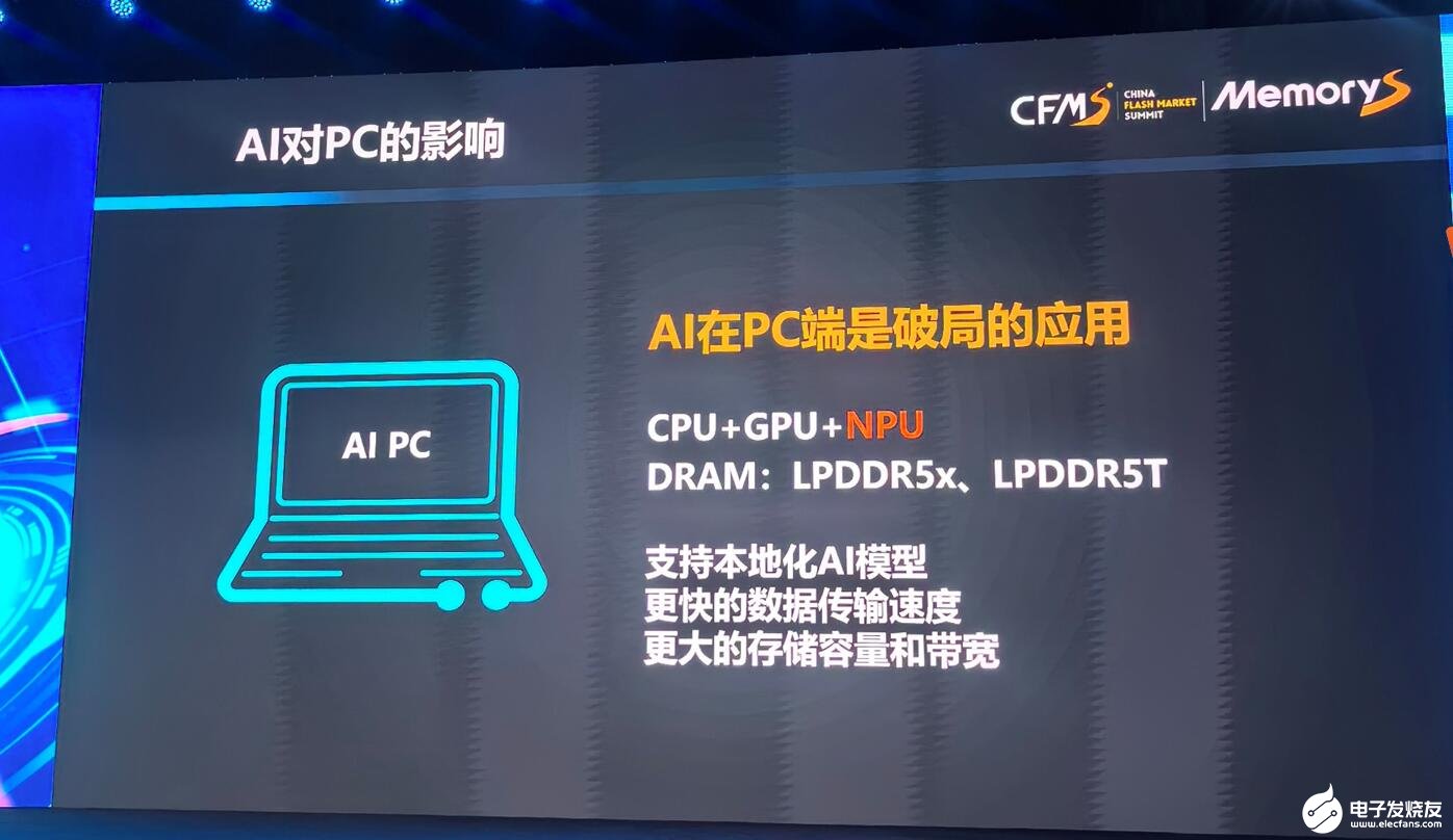 AI PC预计到2024年会迎来应用的破局,与传统PC不同,AI PC最重要的是嵌入了AI芯片,形成“CPU+GPU+NPU”的异构方案。可以支持本地化AI模型,所以需要更快的数据传输速度、更大的存储容量和带宽,主要会带动LPDDR5x和LPDDR5T产品的需求。
