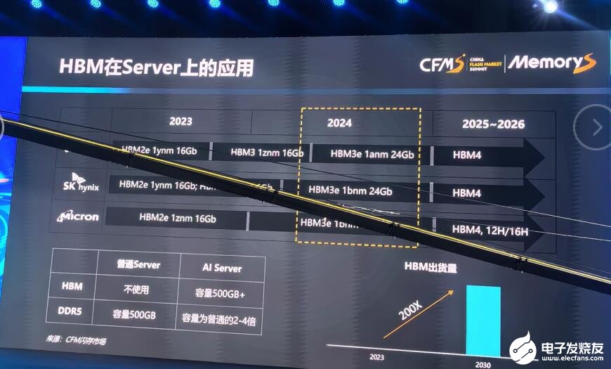 随着大模型的快速爆发,加速了对AI服务器需求,AI服务器中搭载高容量HBM,以及对DDR5的容量需求是普通服务器的2-4倍。目前高端AI服务器GPU搭载HBM芯片已成主流。邰炜表示,HBM占据着极大的利润空间,也是各原厂的必争之地。根据各原厂的规划,2024年将正式进入到HBM3e的量产。