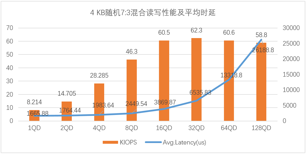 如图4所示,在4KB随机7:3混合读写性能场景中,UH711a在32QD及以下更具优势,IOPS峰值在32QD时可达62.3K,对应平均时延为6535.83 us(6.5ms[1])。当队列深度大于32QD时,IOPS呈下降趋势,平均时延显著增加。
