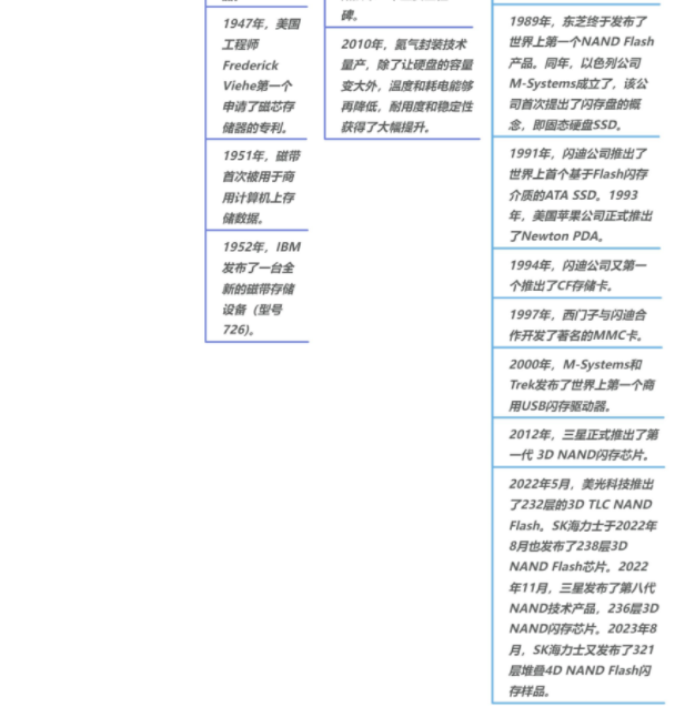 在1956年第一张硬盘被发明的同时,闪存的发展也从未停止脚步,最早从只读存储器(Read-Only Memory,ROM)开始追溯,闪存也经历了从ROM到可电擦除可编程的只读存储器 EEPROM(Elecrically Erasable Programmable ROM,),NOR Flash和NAND Flash相继被发明的阶段。