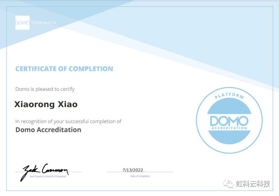 这个证书代表我们完成了Domo基础课程的学习并顺利通过了考核,是Domo对学习者的肯定,也代表我们掌握了Domo这个商业智能分析工具的使用,具备了一定的数据思维驱动决策,在处理事情上更理性,以数据说话。同时,作为一名技术工程师,获得这个认证,也代表未来我可以全方位的为Domo产品的用户提供技术服务。
