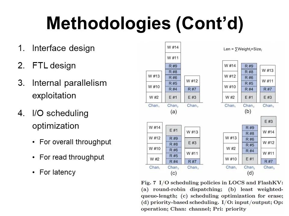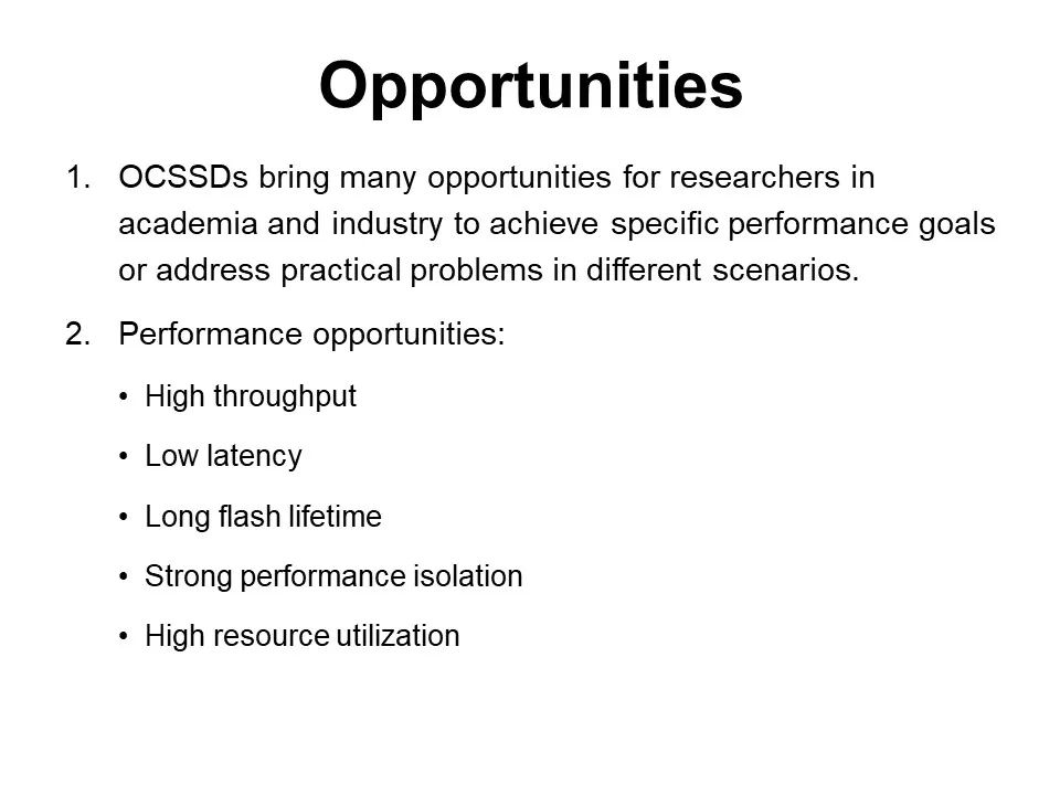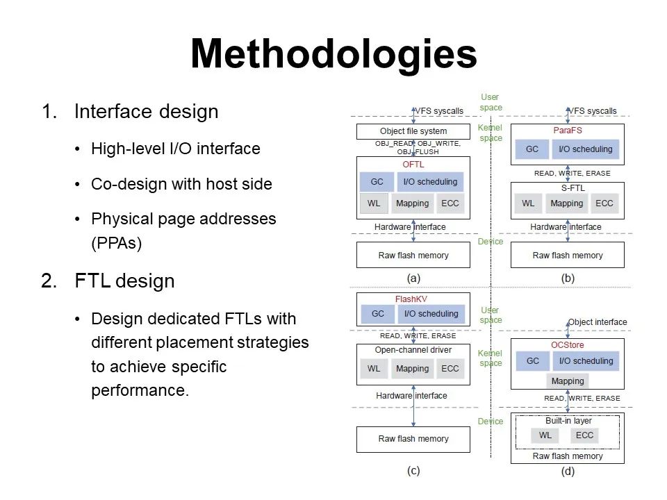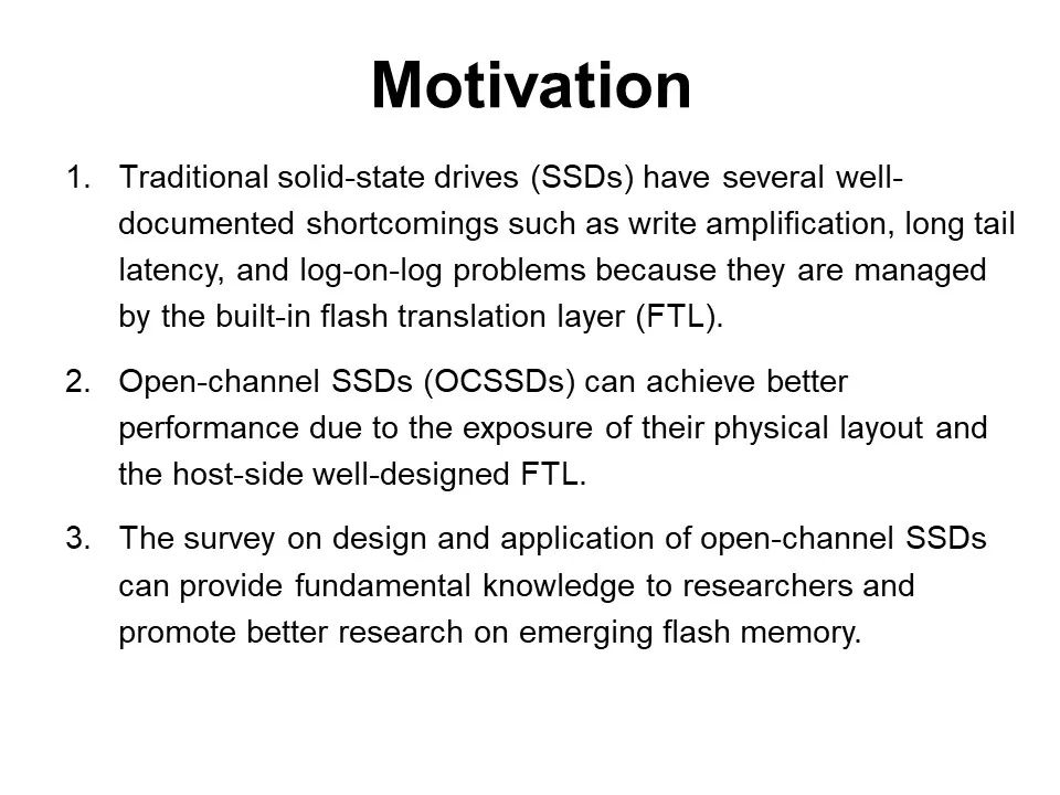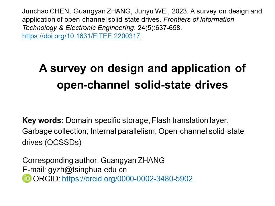 与传统固态硬盘(SSDs)相比,开放通道固态硬盘(OCSSDs)向外暴露了它们内部物理布局,提供了一个基于主机端的闪存转换层(FTL),使得它允许主机端软件根据具体场景和需求控制其内部操作,如垃圾回收(GC)和输入/输出(I/O)调度等。本文对近年来基于OCSSDs的研究工作进行了全面调研,总结了它们如何利用OCSSDs的特性来实现高吞吐量、低访问延迟、长寿命、强性能隔离和高资源利用率等目标,并从接口定制、FTL协同设计、内部并行性挖掘、I/O调度和GC处理等5个方面对这些工作进行了深入研究分析。讨论了目前研究工作的优势和不足,发现几乎所有这些研究方法都面临着性能有效性和管理复杂性之间的困境。本文旨在通过开展综述调研,为希望进入这一领域的研究人员提供关于OCSSDs的基础知识,并进一步激发他们在相关研究工作中的新想法。 关键词: 领域专用存储;闪存转换层;垃圾回收;内部并行性;开放通道固态硬盘(OCSSDs)