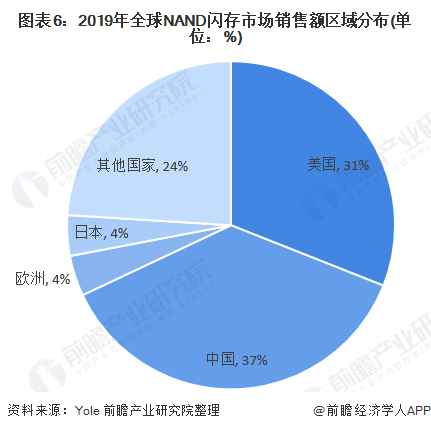 从市场需求来看,中国是对NAND Flash需求最大的市场,根据Yole的数据,2019年中国NAND闪存市场销售额占全球37%,其次是美国的31%。