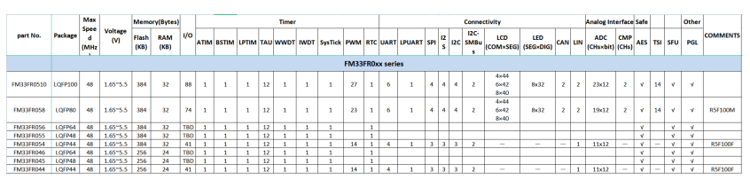 FM33FR0系列基于32位 ARM Cortex-M0内核,最高主频为48MHz,提供最大384KB Program FLASH,8KB Data FLASH(50万次擦写),flash支持ECC;最大32KB RAM,带有奇偶校验;支持LQFP44 / LQFP48 / LQFP64 / LQFP80 / LQFP100多种封装形式。