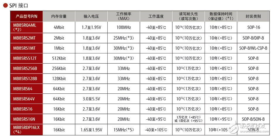 串行接口存储器的产品阵容有16Kbit至4Mbit的SPI接口产品,以及4Kbit至1Mbit的I2C接口产品。电源电压除主要的3.3V工作产品外,正在扩充1.8V工作产品。封装除能够与EEPROM及串行闪存兼容的SOP外,还提供可穿戴设备用SON(Small Outline Non-leadedpackage)及WL-CSP(Wafer Level Chip Size Package)等超小型封装产品。