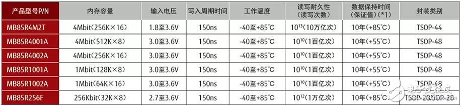 并行接口存储器为采用TSOP或SOP封装的256Kbit至4Mbit的产品,工作时的电源电压为3.3V,但MB85R4M2T能够在1.8V-3.6V的大范围内进行工作。封装方式为能够与SRAM兼容的TSOP或SOP。