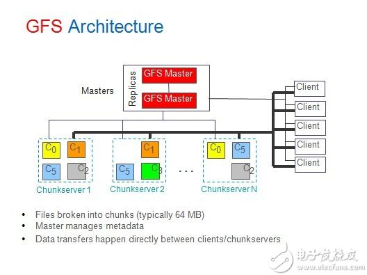 GFS将整个系统分为三类角色:Client(客户端)、Master(主服务器)、Chunk Server(数据块服务器)。