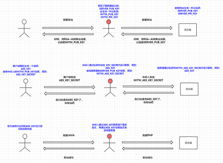 这一次通信再次被中间人截获,中间人自己也伪造了一对公私钥,并将公钥发送给用户以此来窃取客户端生成的AES_KEY,在拿到AES_KEY之后就能轻松的进行解密了。