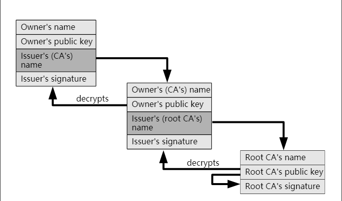 那么客户端(浏览器)又是如何对服务器证书做校验的呢,首先会通过层级关系找到上级证书,通过上级证书里的公钥来对服务器的证书指纹进行解密得到签名(sign1),再通过签名算法算出服务器证书的签名(sign2),通过对比sign1和sign2,如果相等就说明证书是没有被篡改也不是伪造的。