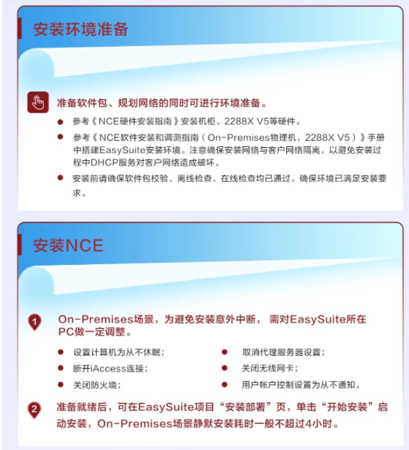 安装调测NCE前,请提前熟悉安装部署方案,选择合适的安装场景。预留充足时间进行NCE软件安装前准备和系统调测。