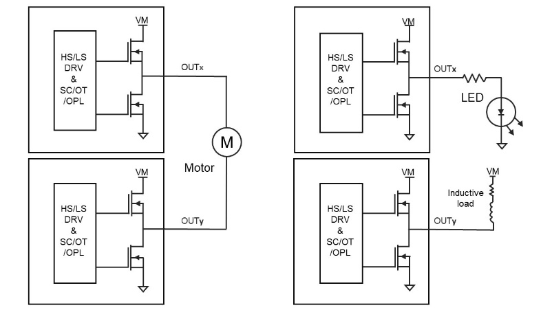 该系列产品诊断功能可全面覆盖各种负载的工作状态,支持多种负载连接方式,包括:半桥,全桥,高边与低边。离线模式下(驱动输出为关闭状态),可帮助系统实现开路诊断,对电池短路诊断,对地短路诊断;在线模式下(驱动输出为工作状态),可实现开路诊断,限流保护功能。对应输出通道的状态与警报可以通过SPI获取对应寄存器上的信息,进而上报至主控制器。
