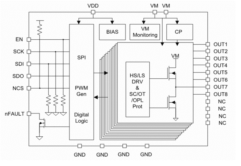 NSD830x-Q1不但能够提供SPI接口与多通道驱动模式,为了使其能更灵活地支持多种负载,还额外配备了多种特色功能:一、PWM生成器