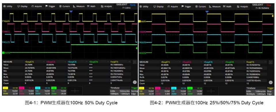 在直流有刷电机的应用中,即使主控芯片不深度介入PWM生成器,电机负载也能够在PWM生成器的协助下实现软启动和调速功能,在LED负载的应用中实现简易PWM调光功能。如图4所示,当寄存器设置输出为100Hz,占空比为25%/50%/75%时,其对应通道能够精确匹配寄存器配置的频率与占空比。