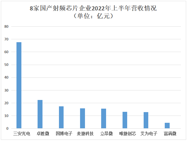 随着本土终端手机品牌厂商的崛起,以及国家政策的大力支持,驱动射频芯片国产替代加速,2022年上半年国内射频企业业绩表现亮眼,在选取的8家国内优秀射频企业中,便有三安光电、国博电子、立昂微和艾为电子的营业收入和净利润实现“双增长”。
