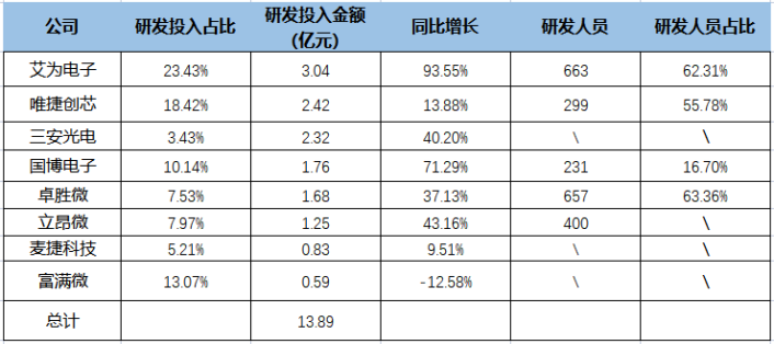 8家射频芯片上市企业在2022年上半年研发投入合计为13.89亿元,其中研发投入超2亿元的有三家,包括艾为电子、唯捷创芯和三安光电,国博电子的研发投入1.76亿元,接近2亿大关。研发投入占比上超10%的有4家,其中艾为电子以23.43%占比最高,值得注意的是艾为电子2022年H1研发投入较去年同期翻了近一倍。同样显著加大研发投入的企业还有国博电子,2022年上半年研发投入1.76亿元,较去年同期增长71.29%。