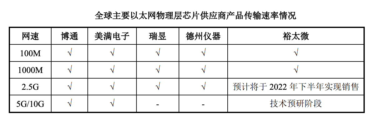 端口数量的产品组合,但缺乏更高速率的以太网物理层芯片,不过相关产品的研发已经在部署中。根据其招股书所示,其2.